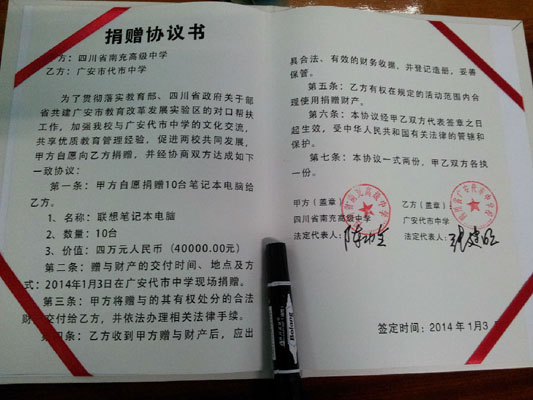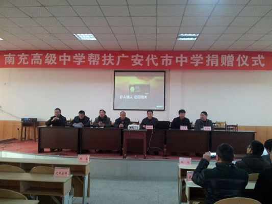 為了貫徹落實(shí)教育部、四川省政府關(guān)于部省共建廣安市教育改革發(fā)展實(shí)驗(yàn)區(qū)的對(duì)口幫護(hù)工作,加強(qiáng)我校與廣安代市中學(xué)的文化交流,共享優(yōu)質(zhì)教育管理經(jīng)驗(yàn),促進(jìn)兩校共同發(fā)展。2014年1月3日下午,我校陳功全校長帶領(lǐng)白紅民副校長、工會(huì)王尚明主席,總務(wù)處、學(xué)工處和部分教師代表前往四川省廣安代市中學(xué),向代市中學(xué)捐贈(zèng)筆記本電腦10臺(tái),用于一線教師改進(jìn)傳統(tǒng)的教學(xué)手段,制作課件、下載資料、演示課件,以期通過教育手段的現(xiàn)代化來促進(jìn)教育的現(xiàn)代化。