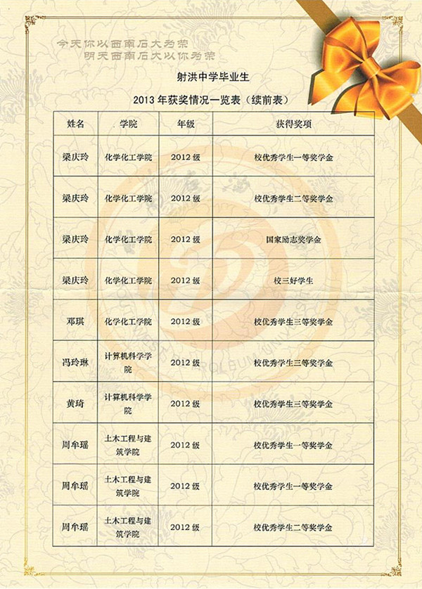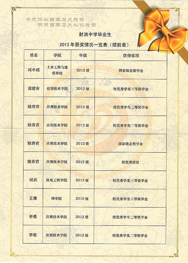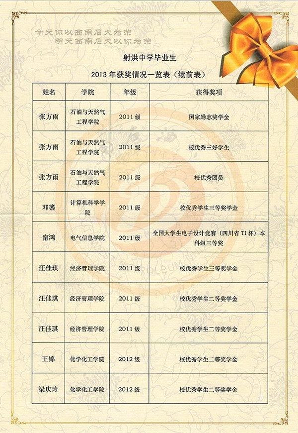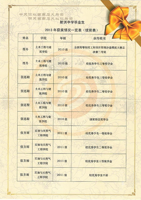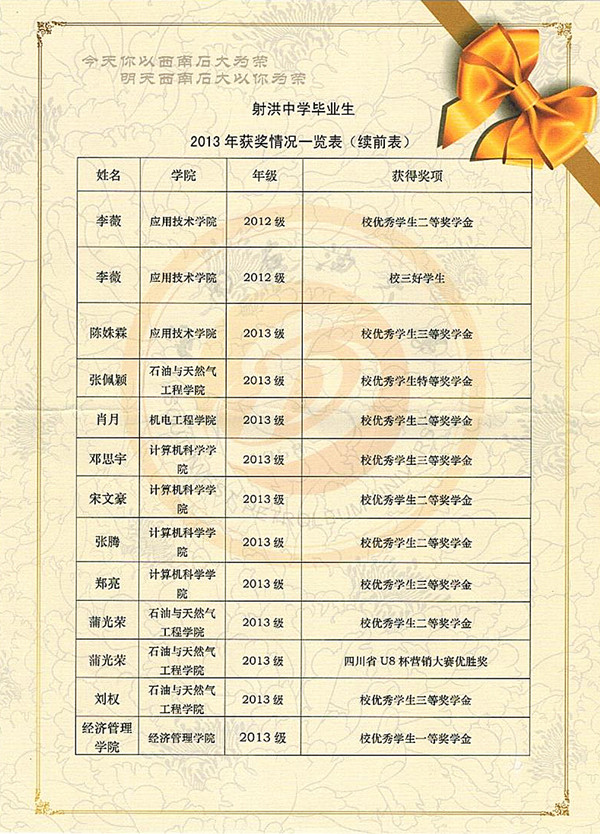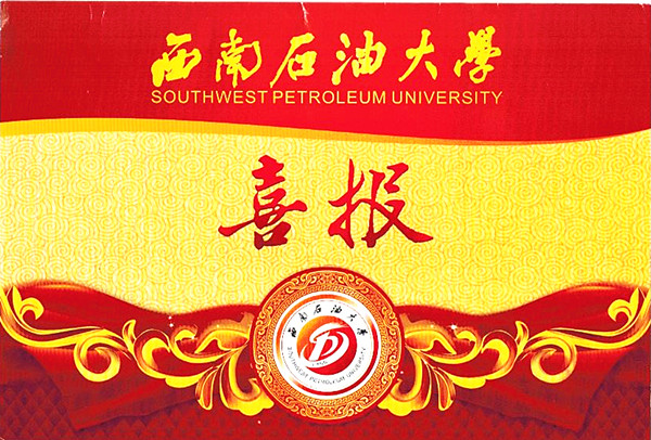 近年,我校為西南石油大學(xué)輸送了眾多優(yōu)秀高中畢業(yè)生。這些學(xué)生在西南石油大學(xué)學(xué)習(xí)成績優(yōu)秀,表現(xiàn)突出,獲得了多項(xiàng)獎(jiǎng)勵(lì)。2014年6月,西南石油大學(xué)特向我校寄來喜報(bào)。
