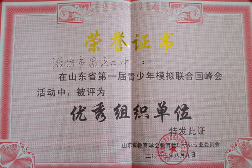 8月7日至9日,山東省第一屆青少年模擬聯(lián)合國峰會(huì)在山東大學(xué)中心校區(qū)舉行,來自全省25所學(xué)校約210名學(xué)生代表參加,經(jīng)過激烈角逐,我校代表團(tuán)榮獲8個(gè)獎(jiǎng)項(xiàng)中的7個(gè),昌樂二中被評(píng)為“優(yōu)秀組織單位”、指導(dǎo)教師李炳成被評(píng)為“優(yōu)秀指導(dǎo)老師”、孫世宇榮獲“最佳杰出代表”,并成為高中組唯一獲得參加2014年4月份在美國舉行的模擬聯(lián)合國大會(huì)資格的學(xué)生,田欣然榮獲“最佳領(lǐng)導(dǎo)力獎(jiǎng)”、馬一超榮獲“最佳演說獎(jiǎng)”、梁新意與丁子鈺榮獲“最佳貢獻(xiàn)獎(jiǎng)”、李巧紅與王心怡榮獲“最佳立場(chǎng)文件獎(jiǎng)”,昌樂二中成為峰會(huì)的大贏家。
