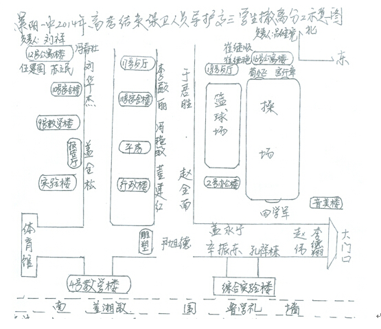 從下面這副《萊陽一中2014年高考結(jié)束保衛(wèi)人員導(dǎo)護高三學(xué)生撤離分工示意圖》可以看出學(xué)校工作的細致入微。