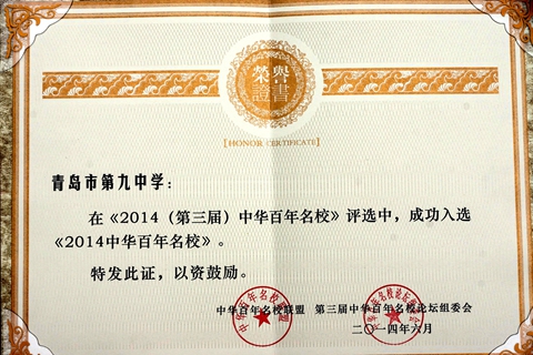 2014(第三屆)中華百年名校論壇暨第三屆《中華百年名!钒l(fā)布會(huì)于2014年6月27日在清華大學(xué)文津國(guó)際酒店成功舉辦。論壇以“百年穿越與價(jià)值回歸”為主題,就“百年對(duì)一所學(xué)校意味著什么”、“百年文化的傳承與發(fā)展”、“百年前西學(xué)東漸對(duì)現(xiàn)代教育的影響”、“中國(guó)傳統(tǒng)教育思想對(duì)當(dāng)代教育的借鑒意義”、“競(jìng)爭(zhēng)環(huán)境中如何打造學(xué)校新的競(jìng)爭(zhēng)力”等議題進(jìn)行了深入討論。本次大會(huì)發(fā)布了《2014第三屆中華百年名!访麊,山東省青島第九中學(xué)成功入選。