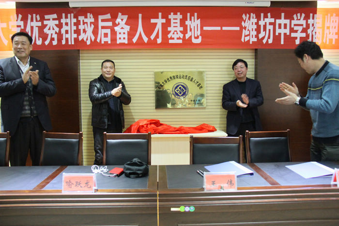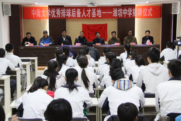 2013年12月30日上午,“中南大學優(yōu)秀排球運動員后備人才基地揭牌儀式”在我校舉行。中南大學體育教研部部長喻躍龍、中南大學體育教研部副部長胡劍宏、中南大學體育教研部辦公室主任彭志偉、濰坊中學校長、黨委書記王偉、濰坊市體育運動學校校長王萬勝、濰坊中學副校長孟令森、濰坊市田徑管理中心主任徐文濤、濰坊中學排管中心主任陳會泉出席了揭牌儀式。濰坊中學藝體部主任劉玉泉主持了會議。
