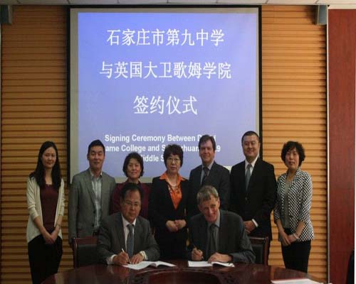 九中校長周軍山與英國大衛(wèi)歌姆學(xué)院校長David 先生共同簽屬了友好學(xué)校備忘錄,石家莊市僑聯(lián)胡翎主席及教育廳領(lǐng)導(dǎo)參加了友好學(xué)校簽屬儀式,胡翎主席就兩校今后合作給了一些指導(dǎo)性建議。