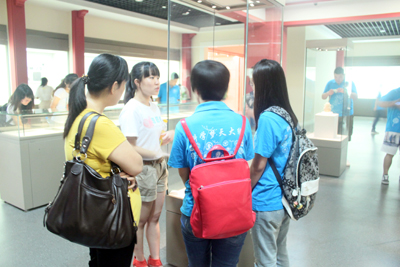 2013年暑假,我校10名志愿者身著“志愿者”T恤,到天津博物館二樓精品廳開展了為期五天的義務(wù)講解活動(dòng)。烈日炎炎,但博物館里人流如織,學(xué)生們?cè)趯⑽奈锏某WR(shí)介紹給聽眾的同時(shí),也用他們的熱情感染著來此參觀的每一個(gè)人。