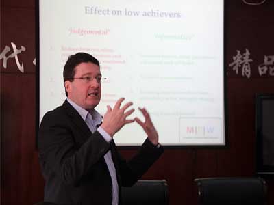 Steve Cook為全體英語教師做了主題為“how to become better teachers”的講座,他具有豐富的學(xué)識、謙虛的態(tài)度,他熱情地為大家講解關(guān)于教學(xué)理念他的一些思考。例如,他談到學(xué)生思考能力的重要性,要先有思考才有表達(dá);學(xué)生學(xué)習(xí)是個積極主動的過程,教師要幫助學(xué)生正確評價自己,鼓勵學(xué)生不斷上進(jìn),要相信每個學(xué)生都有潛力,要充分發(fā)揮他們的潛能。同時,他還強調(diào)課堂教學(xué)形式要多樣有趣,讓學(xué)生參與到學(xué)習(xí)活動中來。