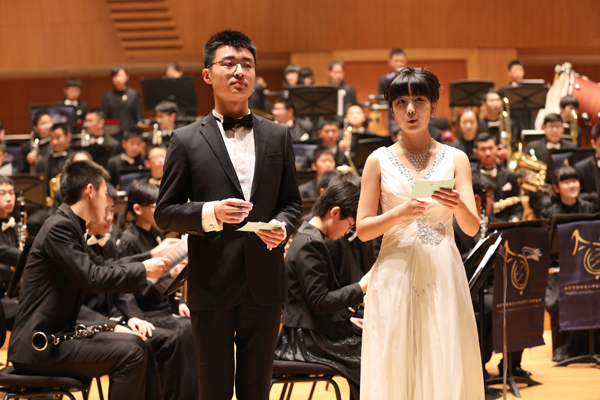 當(dāng)晚,能容納千人的音樂廳賓朋滿座,我校部分全體教職工、各班部分學(xué)生代表、家長代表早早來到音樂廳,興奮的等待著激動的時刻的到來。在黨委于文坤書記的音樂會致辭后,舉行了簡短的贈匾儀式。著名簡帛體書法家王巍為本次盛會親獻墨寶“春之聲”,他帶領(lǐng)30名弟子親自出席音樂晚會并向我校贈送了題字牌匾。整臺節(jié)目共有十一首曲目,分別由我校音樂教研組組長、管樂團團長王圣杰,音樂教師、管樂團副團長朱輝,青年指揮焦子傲擔(dān)任。在場的每一位聽眾都被悠揚的樂曲、團員用心吹奏的狀態(tài)、同學(xué)們扎實的功底感動著,在指揮的帶動下,聽眾們隨著優(yōu)美的旋律,時而屏息靜聽,時而歡快擊掌,現(xiàn)場氣氛激動人心。