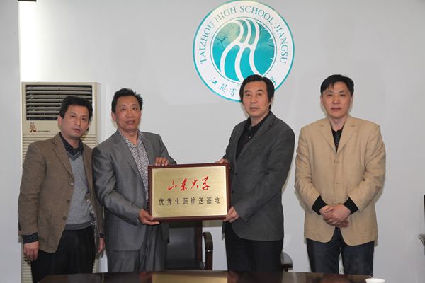 2014年4月14日,山東大學(xué)江蘇省招生小組組長(zhǎng)管從勝教授、化學(xué)與化工學(xué)院黨委副書(shū)記趙希波代表山東大學(xué)專(zhuān)程來(lái)到我校,授予我!皟(yōu)秀生源輸送基地”牌匾。蔣建華校長(zhǎng)、蔡長(zhǎng)春副校長(zhǎng)參加了授牌儀式,并與管教授、趙書(shū)記就當(dāng)前招生工作進(jìn)行了交流和探討。