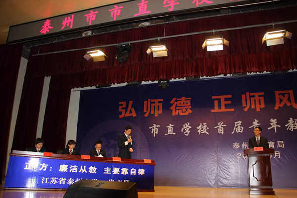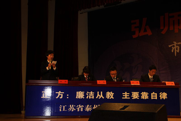 本次活動(dòng),是我校參加泰州市教育局組織的黨的群眾路線教育實(shí)踐活動(dòng)的內(nèi)容之一。我校辯論隊(duì)繼預(yù)選賽圍繞“教書育人苦大于樂(lè)還是樂(lè)大于苦”辯題獲得第一名后,又圍繞“廉潔從教,主要靠自律還是靠他律”與泰州市實(shí)驗(yàn)中學(xué)辯論隊(duì)進(jìn)行了半決賽,與泰州實(shí)驗(yàn)學(xué)校辯論隊(duì)進(jìn)行了決賽,最終獲得了冠軍。