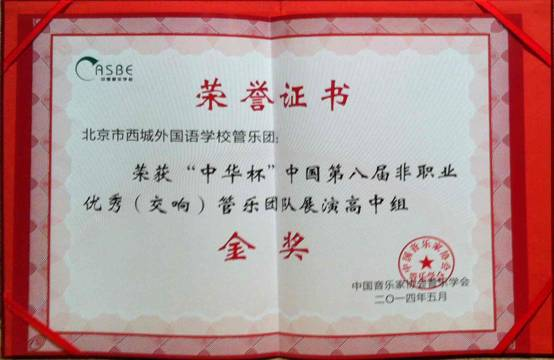 北京市西城外國(guó)語(yǔ)學(xué)校管樂(lè)團(tuán)赴上海參加2014年“中華杯”中國(guó)第八屆非職業(yè)優(yōu)秀管樂(lè)團(tuán)隊(duì)展演,再創(chuàng)佳績(jī),取得巨大成功。在眾多的高水平團(tuán)隊(duì)展演中,我們摘取了高中組“金獎(jiǎng)”,同時(shí)也獲得了首屆中國(guó)“金鐘之星管樂(lè)團(tuán)”的稱號(hào)。樂(lè)團(tuán)以精湛的技藝獲得專家評(píng)委們的一致贊譽(yù),同學(xué)們昂揚(yáng)的精神風(fēng)貌也給組委會(huì)留下了深刻美好的印象。