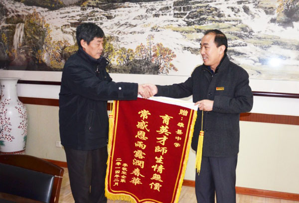 2014年2月21日由我;疾W(xué)生李泰家長李敬軍及其親友一行5人來到我校,在接待室向校長高景奇贈送了“育英才師生情無價,常感恩雨露潤春華”一面錦旗。副校長高哲峰、辦公室主任陳斌、團(tuán)委書記蘇學(xué)良、德育主任龐五盾、高二年級主任周新華、高二18班班主任楊永輝及部分教師學(xué)生代表共計20余人參加了接待活動。