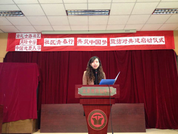 為了全面貫徹黨的十八大、團(tuán)的十七大和市第十三次團(tuán)代會精神,弘揚(yáng)社會主義核心價值觀和“奉獻(xiàn)、友愛、互助、進(jìn)步”的志愿者精神。進(jìn)一步促進(jìn)中學(xué)團(tuán)組織活力和團(tuán)干部能力的顯著提升, 推動學(xué)校與社區(qū)、高校與對口中學(xué)的共建工作。踐行“我的中國夢”主題教育活動。北京市月壇中學(xué)與南禮士路社區(qū)、中國地質(zhì)大學(xué)借此機(jī)會,于12月5日在月壇中學(xué)小禮堂舉行了隆重的結(jié)對共建啟動儀式。參加啟動儀式的領(lǐng)導(dǎo)有:月壇中學(xué)黨支部書記馬曉燕、月壇中學(xué)德育副校長陳真、南禮士路社區(qū)黨委書記蘇寶英、中國地質(zhì)大學(xué)工程技術(shù)學(xué)院團(tuán)總支書記王文冰、南禮士路社區(qū)民警甘靖。我們的活動也在第一時間被人文月壇報刊登載到報頭版頭條的位置。這對同學(xué)們是一次極大的觸動。