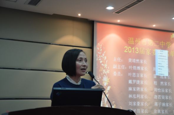 大會上,胡越同學家長等18位優(yōu)秀家長接受了表彰。大會還宣布了溫州二中2013學年家委會名單,黃靖然同學家長葛紅敏女士擔任家委會主任,葉煜濰同學家長陳妤好女士、周成同學家長周吉祥先生擔任家委會副主任。