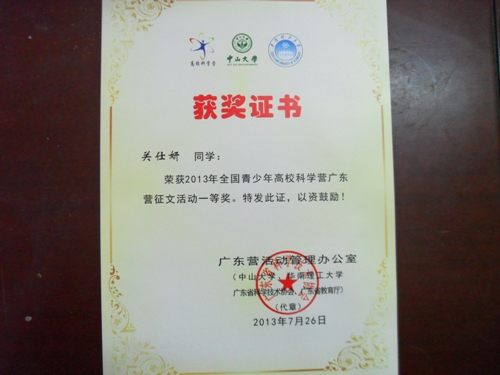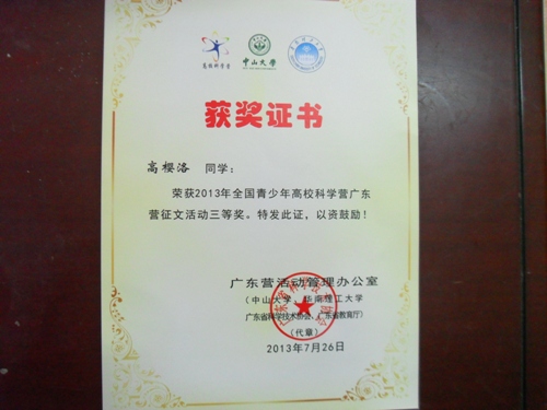 活動(dòng)結(jié)束時(shí)全體400多名營(yíng)員參加了科學(xué)營(yíng)征文比賽,最終評(píng)出一等獎(jiǎng)5篇、二等獎(jiǎng)10篇、三等獎(jiǎng)20篇。我校關(guān)仕妍同學(xué)的《科技之旅,繽紛無(wú)限》獲得一等獎(jiǎng),高櫻洛同學(xué)獲得三等獎(jiǎng),文章刊登在《廣東科技報(bào)?中小學(xué)科教周刊》上。由于萬(wàn)錄品老師帶領(lǐng)一中科學(xué)營(yíng)隊(duì)員取得一系列突出成績(jī),所帶團(tuán)隊(duì)獲得最佳團(tuán)體獎(jiǎng),萬(wàn)錄品老師被省科協(xié)和省教育廳評(píng)為優(yōu)秀帶隊(duì)老師。