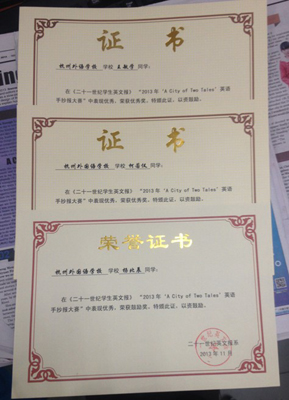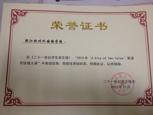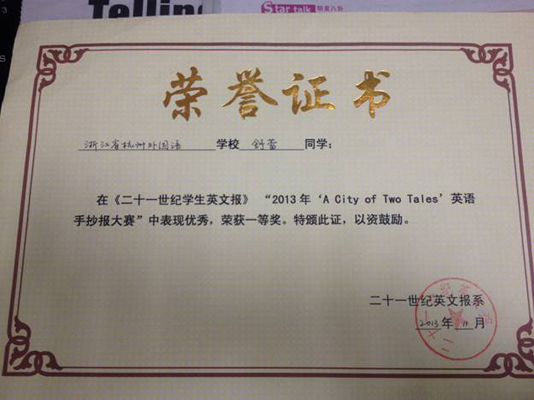 在《二十一世紀(jì)學(xué)生英文報(bào)》“2013年‘A City of Two Tales’ 英語(yǔ)手抄報(bào)大賽”中,我校高一學(xué)生表現(xiàn)優(yōu)秀,舒蕾同學(xué)從一千多份參賽作品中脫穎而出,榮獲唯一的一等獎(jiǎng)。同時(shí)獲獎(jiǎng)的還有朱嘉寅同學(xué)(三等獎(jiǎng));柯若義同學(xué)和王敏學(xué)同學(xué)(優(yōu)秀獎(jiǎng));楊北辰同學(xué)(鼓勵(lì)獎(jiǎng))。我校榮獲優(yōu)秀組織獎(jiǎng)。在此,向獲獎(jiǎng)同學(xué)表示祝賀,并向組織和輔導(dǎo)參賽的英語(yǔ)老師表示感謝。