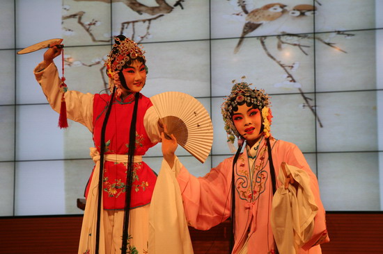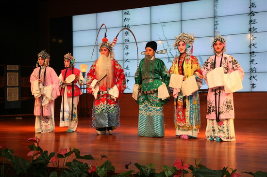 隨后由實(shí)驗(yàn)中學(xué)京劇社和歷屆畢業(yè)生聯(lián)袂奉獻(xiàn)的“梨園溢彩”主題演出,更是把600年昆曲,200年京劇的精髓表現(xiàn)的淋漓盡致。牡丹亭《游園》詮釋了昆曲之雅,之美,贏得現(xiàn)場專家的連聲叫好。隨之而來的生、旦、凈、丑經(jīng)典劇目表演,更是把師生引入戲曲的世界,引入京劇的情境。在校學(xué)生和畢業(yè)生攜手,女老生獻(xiàn)藝,實(shí)驗(yàn)“四大名旦”齊聚,兩位包公護(hù)駕,讓學(xué)生大呼過癮,同時(shí)也讓他們?cè)谛蕾p中了解京昆藝術(shù)。吳荻老師現(xiàn)場書法的串場,樊后君老師帶領(lǐng)高二學(xué)生的吟誦,畫龍點(diǎn)睛,異常精彩。特約京劇丑角表演更是把整場演出推向高潮,也在歡笑中闡釋了戲曲的玄妙。中國京劇院吳江院長不僅做出了精彩點(diǎn)評(píng),還同蔡曉東校長一起為吳荻老師頒發(fā)“吳荻非物質(zhì)文化遺產(chǎn)傳承工作室”牌匾,以激勵(lì)吳老師為傳承中華傳統(tǒng)文化再接再厲。