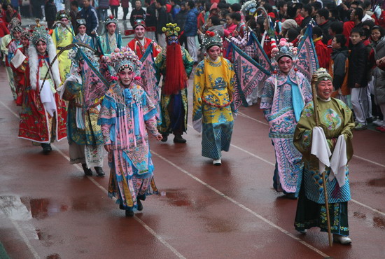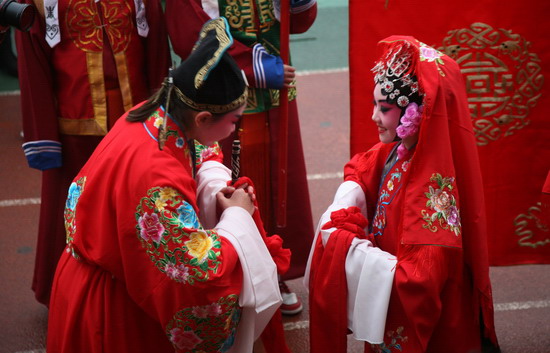2012年12月14日,北京,瑞雪紛飛,銀裝素裹。實(shí)驗(yàn),張燈結(jié)彩,喜氣洋洋。第五屆中華傳統(tǒng)文化節(jié)在鑼鼓聲中拉開帷幕。以蔡曉東校長和程鳳春書記為首的校長團(tuán)全套彩妝作出表率,與師生同樂,蘇海燕老師帶領(lǐng)的初二年級(jí)班主任更以戲曲里的“才子佳人”為主題為師生帶來視覺盛宴。參加本屆文化節(jié)開幕式的嘉賓有全國政協(xié)常委、中國京劇院原院長、國家一級(jí)編導(dǎo)吳江先生以及中國文學(xué)藝術(shù)基金會(huì),中國非物質(zhì)文化校園傳承基金執(zhí)行理事長黃儉先生。還有給予學(xué)校大力支持的武警總部直屬支隊(duì)的翟康太副政委和張占周主任。