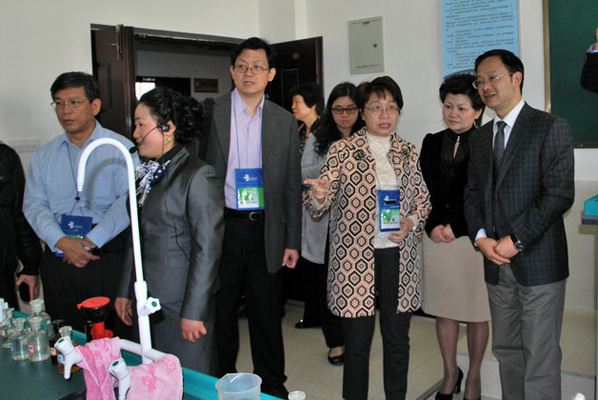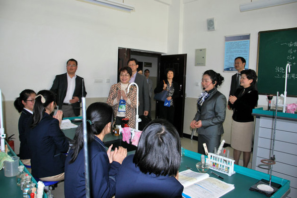 上午10時許,考察團(tuán)驅(qū)車來到學(xué)校綜合實驗大樓前,吳宏率隊迎接。我校綜合實驗大樓由澳門特別行政區(qū)全額援建,現(xiàn)已全部投入使用。此次澳門考察團(tuán)來訪,將重點考察綜合實驗大樓的使用情況。姜倩引領(lǐng)來賓們首先觀看了學(xué)校陳列在實驗大樓下面的多組展板,介紹了學(xué)校的基本情況、發(fā)展特色,學(xué)校綜合實驗大樓的修建和使用情況,學(xué)校開展感恩教育及取得的成果等。隨后,來賓們參觀了物理、化學(xué)、生物實驗室,通用技術(shù)、音樂教室和心理咨詢室等功能室,與正在上課的師生以及功能室管理教師進(jìn)行親切交流。