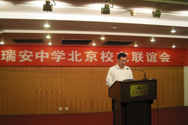 5月26日上午,瑞安中學(xué)北京校友會2013年聯(lián)誼會在西單山水賓館多功能廳隆重召開,瑞安市副市長鄭海潔、瑞安市政協(xié)副主席、瑞安中學(xué)校長陳良明和工作在首都各條戰(zhàn)線上的140多位校友及部分瑞籍人士參加了會議。