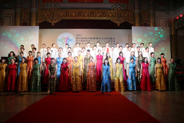 圖為 我校金帆合唱團(tuán)60名學(xué)生在第四屆中日韓教育旅游研討會(huì)上演唱三國民歌