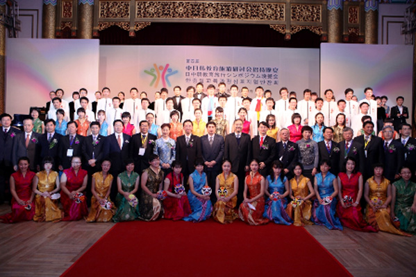 在當(dāng)天晚上由主辦方舉行的晚宴上,我校金帆合唱團(tuán)60名學(xué)生載歌載舞,為到會(huì)的三國代表演唱了韓國民歌《桔梗謠》、日本民歌《故鄉(xiāng)》和中國歌曲《唱臉譜》。精彩的演出受到與會(huì)者熱烈歡迎,把宴會(huì)氣氛推向高潮。演出結(jié)束后,全體演員與到會(huì)的三國政府官員合影。