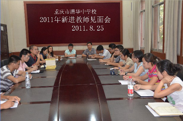 會(huì)議在親切喜慶的氣氛中開(kāi)始,首先各位新進(jìn)教師作自我介紹,接著各處室負(fù)責(zé)人對(duì)新進(jìn)教師要盡快熟悉的相關(guān)工作進(jìn)行了說(shuō)明,最后鄧朝陽(yáng)校長(zhǎng)對(duì)新進(jìn)教師作了“八點(diǎn)要求”。一是要耐得住寂寞,守得住清貧,經(jīng)得起誘惑,踏踏實(shí)實(shí)搞好教書(shū)育人工作;二要不斷加強(qiáng)學(xué)習(xí),潛心鉆研業(yè)務(wù),學(xué)以立德,學(xué)以增智,學(xué)以創(chuàng)業(yè);三要加強(qiáng)自身修養(yǎng),踐行社會(huì)主義核心價(jià)值觀;四要切實(shí)維護(hù)好自身和學(xué)校形象,做“自強(qiáng)不息、厚德載物”的重慶清華人;五要有愛(ài)心,有信心,有耐心,并讓學(xué)生感受到你對(duì)他的愛(ài);六要公平公正地對(duì)待學(xué)生,樹(shù)立民主與公平的教育觀;七要研究學(xué)生,走進(jìn)學(xué)生心靈深處,研究課標(biāo),開(kāi)發(fā)教材,寫(xiě)好教學(xué)反思;八要有遠(yuǎn)大理想,有切實(shí)可行的職業(yè)規(guī)劃,力爭(zhēng)早日脫穎而出,早日成為我校、區(qū)市乃至全國(guó)的教育教學(xué)骨干。