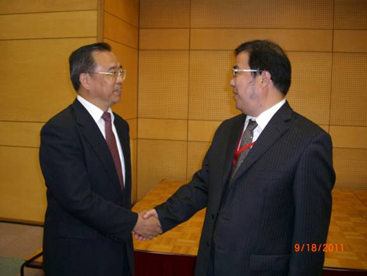 中國(guó)駐日大使館公使呂克儉先生和方校長(zhǎng)握手交談