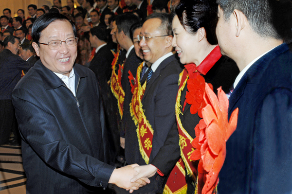 省長(zhǎng)陳政高接見遼寧省全國勞動(dòng)模范,與高琛校長(zhǎng)握手。