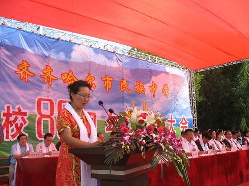 金風(fēng)送爽慶節(jié)日,嫩水揚(yáng)波迎嘉賓。今天,我們各民族同胞歡聚在校園,隆重慶祝齊齊哈爾市民族中學(xué)建校八十周年。這是齊齊哈爾市民族中學(xué)全體師生和新老校友期盼已久的盛大節(jié)日。在這歡樂的時刻,我謹(jǐn)代表民族中學(xué)全體師生, 向前來參加校慶的,并一直關(guān)懷、支持和幫助學(xué)校發(fā)展進(jìn)步的全國民族中學(xué)協(xié)會的領(lǐng)導(dǎo)、省教育廳的領(lǐng)導(dǎo)、省民委的領(lǐng)導(dǎo)和齊齊哈爾市委、市人大、市政府、市政協(xié)以及市教育局、市民宗局的各位領(lǐng)導(dǎo),向長期關(guān)注民族教育事業(yè),并對民族中學(xué)發(fā)展做出貢獻(xiàn)的社會各界來賓,向曾經(jīng)在民族中學(xué)這塊熱土上辛勤耕耘的老領(lǐng)導(dǎo)、老教師,向心系母校、支持民族中學(xué)發(fā)展的歷屆校友,表示熱烈的歡迎、誠摯的感謝和崇高的敬意!同時,我以個人的名義,向全校師生員工致以親切的節(jié)日的問候!