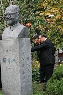 與校友李駿修讀老校長(zhǎng)趙憲初銅像銘文