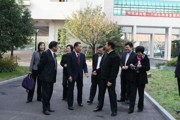 上午9點(diǎn),南模中學(xué)校長(zhǎng)高屹、上海市教委副主任、我校67屆校友李駿修以及副校長(zhǎng)鄭芝英、盧久紅等在天平路200號(hào)南洋模范初級(jí)中學(xué)(原南模中學(xué))校門(mén)口迎接我校校友李源潮及夫人高建進(jìn)。剛過(guò)9點(diǎn),李源潮部長(zhǎng)就和夫人的車(chē)就來(lái)到了校門(mén)口,并與李駿修主任和高屹校長(zhǎng)等緊緊握手。在南模中學(xué)領(lǐng)導(dǎo)班子成員的陪同下,李部長(zhǎng)和夫人下車(chē)后首先興致勃勃地參觀了校園,與校友李駿修仔細(xì)研讀了趙憲初老校長(zhǎng)銅像的銘文并與李駿修副主任、高屹校長(zhǎng)等在趙校長(zhǎng)銅像前合影留念。在參觀校園的途中,南模中學(xué)老校長(zhǎng)、當(dāng)時(shí)的物理老師張茂昌趕到了校園,與李部長(zhǎng)相會(huì)于母校。師生、校友共同回憶起當(dāng)年的校園生活,仿佛恍若昨日。隨后,高屹校長(zhǎng)等陪同李部長(zhǎng)等校友一行回到了敬信樓底樓會(huì)議室。在敬信樓底樓會(huì)議室,李部長(zhǎng)欣然為母校題詞:“發(fā)現(xiàn)世界,照亮人生”。隨后,李部長(zhǎng)在回顧自己中學(xué)生活后指出:學(xué)校教育要尊重學(xué)生的創(chuàng)造精神,要保護(hù)學(xué)生的積極性,要激勵(lì)學(xué)生的榮譽(yù)心,他以自己在南模讀書(shū)時(shí)曾經(jīng)有一篇作文在紅樓展出的例子來(lái)說(shuō)明保護(hù)孩子的榮譽(yù)心是多么的重要;教師要真心熱愛(ài)學(xué)生,李部長(zhǎng)回憶自己在讀初中的時(shí)候跳山羊沒(méi)有跳過(guò),當(dāng)時(shí)體育老師就個(gè)別留他下來(lái)一遍又一遍地教他,這才是真正地關(guān)愛(ài)學(xué)生。李部長(zhǎng)的講話對(duì)在場(chǎng)的每一位教師都有深刻的教育意義,同時(shí)也是對(duì)我們?nèi)w教師提出了希望和要求。賓客在輕松愉快的交談中結(jié)束了對(duì)母校的回訪。最后,李部長(zhǎng)和夫人與學(xué)校陪同的行政一起在“青鋒石“前合影留念。