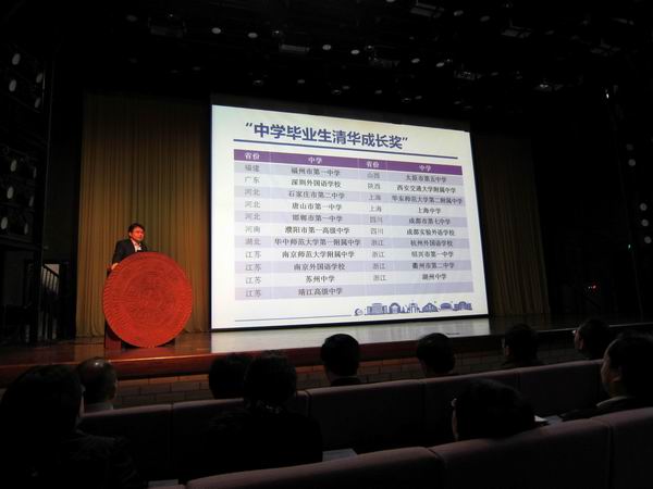 會上,清華大學(xué)向參會的全國各知名高中校長做了主題為:2014年清華大學(xué)“新百年計劃”的政策解讀和關(guān)于高校招生制度改革高校招生層面的思考的報告,并對該校2013屆畢業(yè)生的情況進行了總結(jié),進行了“中學(xué)畢業(yè)生清華成長獎”頒獎儀式。