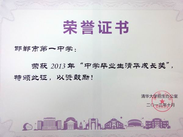 我校憑借特色的辦學(xué)理念、優(yōu)質(zhì)的教育質(zhì)量獲得“2014年清華大學(xué)‘新百年領(lǐng)軍計劃’優(yōu)質(zhì)生源基地,這是自清華大學(xué)“新百年領(lǐng)軍計劃”開展三年來我校連續(xù)三年獲得該項殊榮。該項殊榮意味著我校獲得清華大學(xué)2014年“校長實名推薦”資格。清華大學(xué)依據(jù)我校優(yōu)秀校友在該校的成長情況,還授予我?!爸袑W(xué)畢業(yè)生清華成長獎”,河北省僅有邯鄲市一中、石家莊二中和唐山一中三所高中獲此獎項。同時,清華大學(xué)還就我校09屆校友崔潤鵬同學(xué)獲“清華大學(xué)優(yōu)秀畢業(yè)生稱號”向我校表示祝賀。