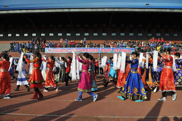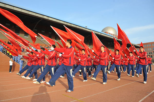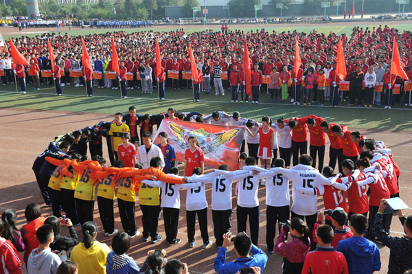 2013年9月30日,呼市二中召開(kāi)了2013年體育運(yùn)動(dòng)周暨“美利達(dá)”杯秋季田徑運(yùn)動(dòng)會(huì)。開(kāi)幕式還未開(kāi)始,各班級(jí)的同學(xué)就已經(jīng)開(kāi)始整理隊(duì)伍、準(zhǔn)備上陣了,大家都積極地配合著開(kāi)幕式的“步調(diào)”,有條不紊地進(jìn)行著最后的籌劃。舞動(dòng)在二中校園中的每一抹色彩都是那樣精彩而活躍,可謂“天上云澤,地上彩虹;長(zhǎng)河鯤鵬,滿園星空”。開(kāi)幕式“開(kāi)始命令”下達(dá)后,校紅旗隊(duì)和各班隊(duì)伍依次整齊劃一地通過(guò)主席臺(tái),矯首昂姿、勢(shì)如春江,使人不禁為之動(dòng)容,主席臺(tái)上的校領(lǐng)導(dǎo)與老師都對(duì)此予以了積極的評(píng)價(jià),用掌聲肯定同學(xué)們的努力與付出。在整齊的隊(duì)伍中,凸顯個(gè)性的方陣表演也讓我們眼前一亮。在體現(xiàn)運(yùn)動(dòng)會(huì)整體協(xié)調(diào)性的基礎(chǔ)上,同學(xué)們的創(chuàng)意都很好的展示了各自班級(jí)的風(fēng)采,豐富了運(yùn)動(dòng)會(huì)開(kāi)幕式的內(nèi)容與形式,增添了運(yùn)動(dòng)會(huì)輕松愉快氣氛。