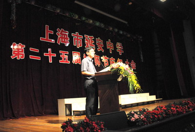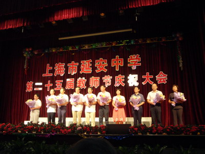郭雄校長(zhǎng)圍繞 “弘揚(yáng)延安精神,夯實(shí)師德基石”這一主題首先作了熱情洋溢的發(fā)言,并代表學(xué)校向所有教育工作者們致以了親切的問(wèn)候和誠(chéng)摯的祝福。接著四位學(xué)生代表飽含深情地朗誦了詩(shī)歌《獻(xiàn)給老師的歌》,隨后主持工作的黨委副書(shū)記馬越同志宣布了榮獲市、區(qū)模范教師和園丁獎(jiǎng)等稱(chēng)號(hào)的教工名單,學(xué)生代表向2009年的獲獎(jiǎng)?wù)撸喝f(wàn)技偉、周海寧、郭雄、劉定爽、楊可夫、王文東、朱才龍、范欽溕、夏靜松、殷世勝十位老師獻(xiàn)上了美麗的鮮花。胡楨佳和封一帆兩位同學(xué)還分別上臺(tái)介紹了榮獲上海市“優(yōu)秀班主任”、“模范教師”稱(chēng)號(hào)的萬(wàn)技偉老師和獲長(zhǎng)寧區(qū)“模范教師”稱(chēng)號(hào)、長(zhǎng)寧區(qū)園丁獎(jiǎng)稱(chēng)號(hào)的周海寧老師的優(yōu)秀事跡。兩位主持人也輪番介紹了榮獲市、區(qū)園丁獎(jiǎng)等稱(chēng)號(hào)的八位老師的優(yōu)秀事跡。