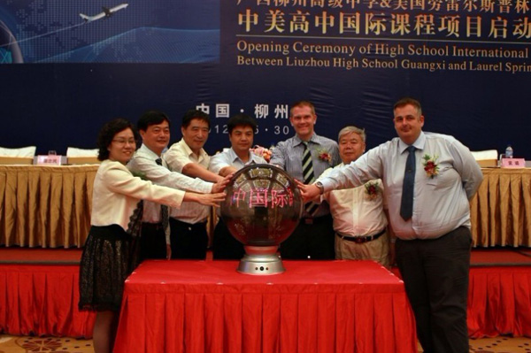 2012年5月30日上午十點半,廣西柳州高級中學在柳州市麗笙酒店舉行了“柳州高中中美高中國際課程項目班”成立啟動儀式。出席會議的有市委常委、副市長劉健生、市教育局局長撒忠民、副局長程卓、李秀敏、美國勞雷爾斯普林斯學校代表Timothy Gary Hodgden、澳大利亞教育基金會中國區(qū)總裁于鵬、柳州高中校長李昌林、各縣區(qū)領導及教育部門領導、各兄弟學校領導和駐柳各大媒體的記者。在啟動儀式上,李昌林校長、撒忠民局長和劉健生副市長等領導先后發(fā)表講話。李昌林校長對柳州高中中美高中國際課程項目班作了詳細介紹。發(fā)布會由柳州高中陳賢庭副校長主持。