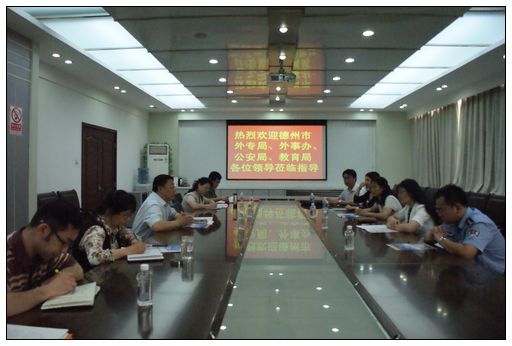 5月23日上午,德州市外國(guó)專家局、德州市外事辦、德州市公安局、德州市教育局等四個(gè)單位領(lǐng)導(dǎo)來(lái)到德州一中,考察我校外事工作和聘請(qǐng)外國(guó)專家資格的申請(qǐng)工作。