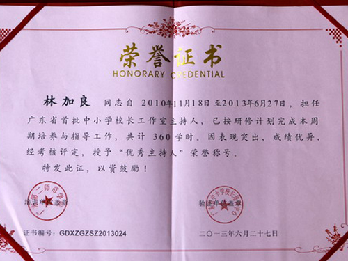 林校長自2010年11月18日擔(dān)任廣東省首批中小學(xué)校長工作室主持人以來,對入室成員校長進(jìn)行培養(yǎng)和指導(dǎo),表現(xiàn)突出,成績優(yōu)異,在考核評定中,得到了全體專家的一致肯定與高度贊揚(yáng),榮獲了“優(yōu)秀主持人”光榮稱號。
