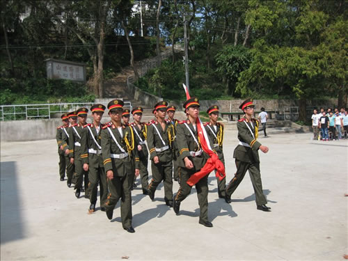 國旗班成立于三年前。國旗班“戰(zhàn)士”是從當(dāng)年參加軍訓(xùn)的優(yōu)秀學(xué)員中選拔而來的,后又聘請幫訓(xùn)部隊專職升旗手對他們進(jìn)行專業(yè)培訓(xùn)。在學(xué)校每周的升旗儀式上,這一抹靈動的“軍綠”不僅是亥山腳下一道亮麗的風(fēng)景,更是休中的一張亮麗名片;他們升起的也不僅是一面鮮紅的旗幟,更是休中學(xué)子積極向上、昂揚(yáng)奮發(fā)的“精神旗幟”。
