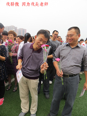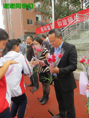 九月的青龍場,秋風(fēng)送爽,丹桂飄香。今秋全面進(jìn)駐青龍場的成都市實驗中學(xué)洋溢著濃郁的節(jié)日氣氛。上午九點半,全校兩千多名師生齊聚操場,共同慶祝第二十九個教師節(jié)。活動由校團(tuán)委、學(xué)生會組織?;顒又校呷昙壍膶W(xué)生朗誦了他們自己創(chuàng)作的詩歌《致老師》,全校39個班的學(xué)生代表向所有的教職工贈送了鮮花和卡片,全體同學(xué)齊唱歌曲《每當(dāng)我走過老師的窗前》,掌聲、歌聲、鮮花、賀卡......同學(xué)們用最純真的語言表達(dá)了對老師的敬意。高亢嘹亮的學(xué)生集體宣誓,向國旗、向全校老師表達(dá)了他們對新學(xué)期、新目標(biāo)、新征程的無限信心,整齊的歌聲、嘹亮而莊嚴(yán)的誓言把本次活動推向了高潮。教師代表李紅梅主任發(fā)表了《致實驗中學(xué)學(xué)生的一封信》,學(xué)校黨總支書記、校長劉云同志用精煉的語言概述了學(xué)校的總體發(fā)展思路,展現(xiàn)了成都實驗美麗的夢境,向全校師生發(fā)出了“立足青龍,心系未來,放眼世界,為成就明天的輝煌而奮發(fā)努力!”的號召,對同學(xué)們提出了殷切希望:希望同學(xué)們要遵規(guī)守紀(jì)、熱愛學(xué)習(xí)、品學(xué)兼優(yōu),要虛心接受老師的教誨或指導(dǎo),認(rèn)真完成或落實老師布置的學(xué)習(xí)要求,以實際行動感恩教師,以優(yōu)異的成績回報老師!