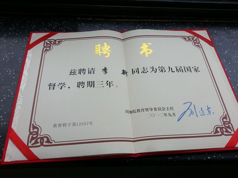 2012年10月11日,我校李新校長赴北京接受教育部聘任,受聘為第九屆國家督學(xué),這是天津一中和我市基礎(chǔ)教育的光榮!