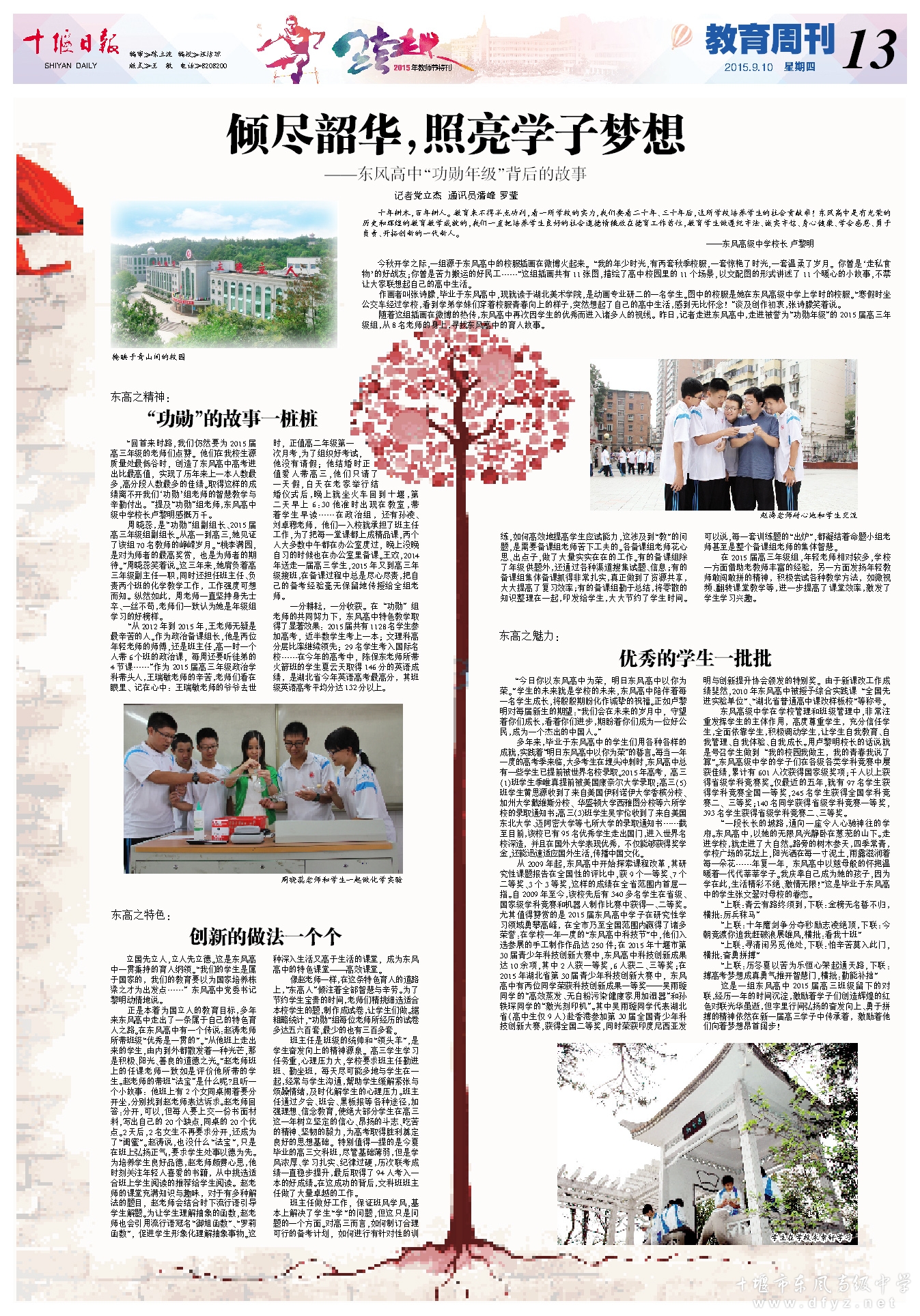 隨著這個(gè)微博的熱傳,東風(fēng)高中再次因?qū)W生的優(yōu)秀而進(jìn)入諸多人的視線。昨日,記者走進(jìn)東風(fēng)高中,走進(jìn)被譽(yù)為“功勛年級(jí)”的2015屆高三年級(jí)組,從8名老師的身上,尋找東風(fēng)高中的育人故事。