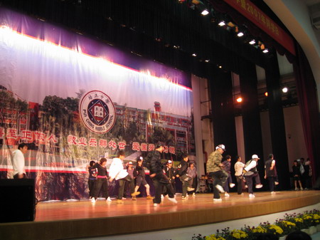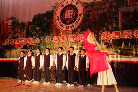 初一級同學(xué)表演的古詩文朗誦《古來征戰(zhàn)幾人還》是今年文藝匯演的一大亮點(diǎn),氣勢磅礴,仿佛把人們帶到了黃沙滾滾、悲壯蒼涼的古代邊塞,感受古代戰(zhàn)士對國家深沉的愛。還有培正流行健康舞隊(duì)的精彩表演,他們用跳動的舞步,演繹青春的激情,跳出健康,舞出流行,舞出中學(xué)生的青春活力。這個舞蹈隊(duì)還剛剛獲得了首屆廣州市動感地帶中學(xué)生活力大賽街流行健康舞組一等獎。最后,呂超、戴東祥、簡小敏三位校長帶著部分教師,共同表演了男聲小組唱《再見吧朋友》《我和我的祖國》,再一次掀起全場高潮。文藝匯演在熱烈的氣氛中圓滿結(jié)束。