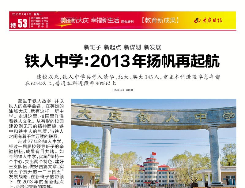百年樹人,新起點就在腳下,未來并不遙遠。2013年,鐵人中學(xué)將承載著英雄城的未來夢,揚帆再起航!
