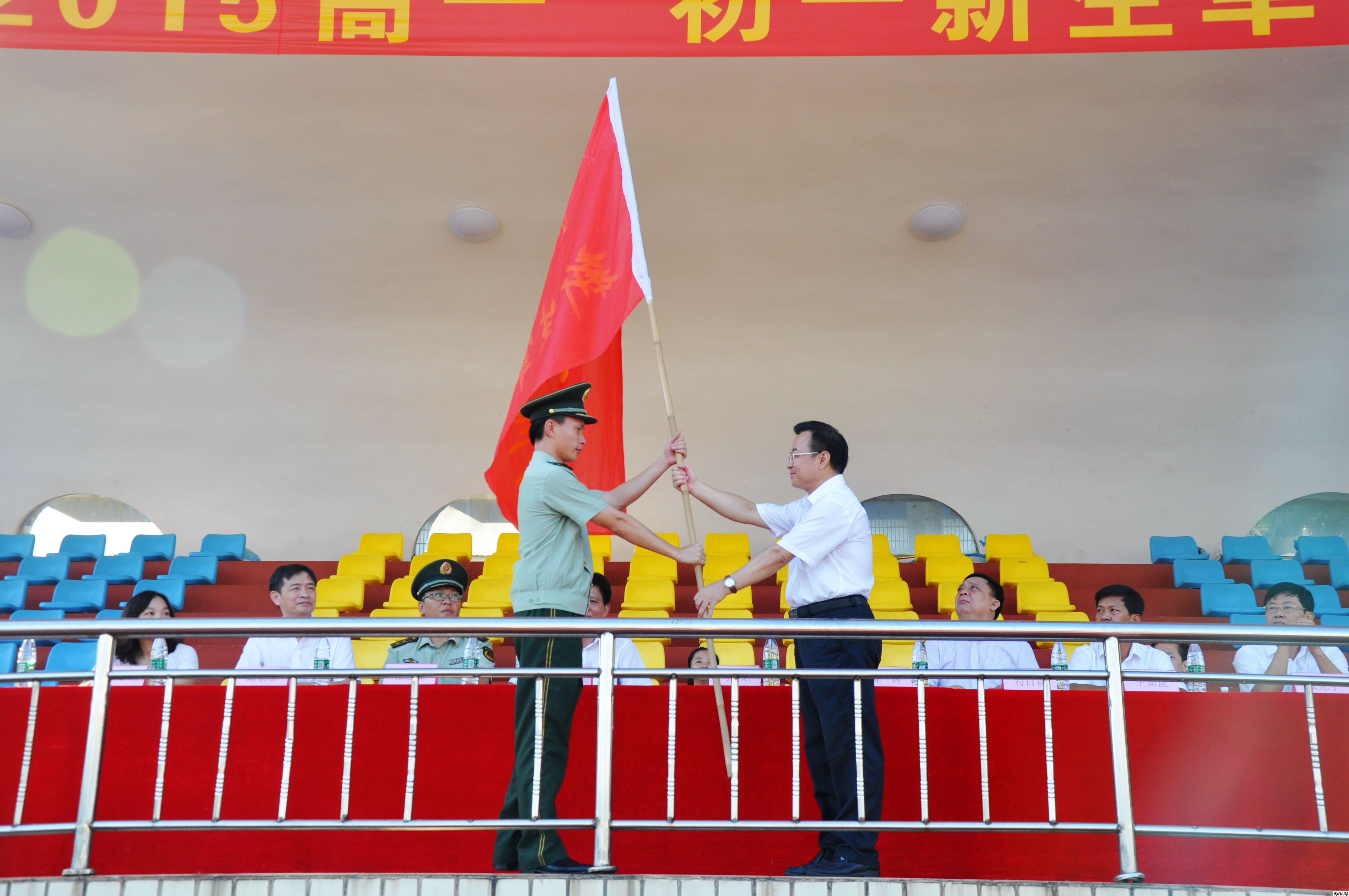 海南中學馬向陽校長、黨委周宏慈書記、武警海南省總隊一支隊政治部主任張韻臻上校、海南中學陳東華副校長、韓小雨副校長、初中部王如琨副校長、張光寧副校長、符日喜副校長、一支隊政治指導員李平嵩上尉等學校及軍訓部隊的領導在主席臺上就坐,與2015級新生一起參加了今天的軍訓開營儀式。