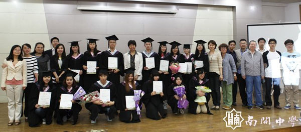 2013年5月27日,南開中學(xué)國際部舉行了2013屆高、初三年級(jí)畢業(yè)典禮。馬躍美校長出席了畢業(yè)典禮并為畢業(yè)生們頒發(fā)了畢業(yè)證書。國際部2013屆初、高三畢業(yè)年級(jí)學(xué)生共有19人,其中高中畢業(yè)生16人,初中畢業(yè)生3人。畢業(yè)生們?cè)趯W(xué)業(yè)上取得了優(yōu)異的成績,印廷宰等8名同學(xué)在漢語水平考試中達(dá)到最高級(jí),并獲得了國際部頒發(fā)的獎(jiǎng)學(xué)金。李裕定同學(xué)已被北大國際關(guān)系學(xué)院錄取、李韓美同學(xué)已被北大生命科學(xué)院錄取,王安然同學(xué)已被北大醫(yī)學(xué)部錄取,樸有娜同學(xué)已被人民大學(xué)錄取,其他同學(xué)還在等待清華大學(xué)、上海交大等知名高校的錄取通知。