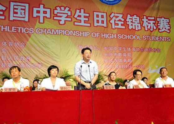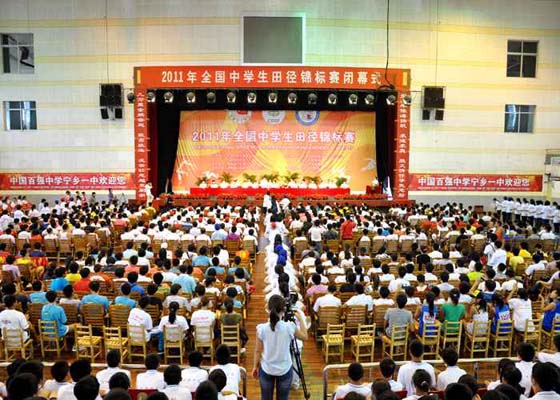 8月11日下午5點(diǎn),歷時(shí)6天的2011年全國(guó)中學(xué)生田徑錦標(biāo)賽在湖南省寧鄉(xiāng)縣第一高級(jí)中學(xué)體育館圓滿落幕。寧鄉(xiāng)縣委副書記吳石平,寧鄉(xiāng)縣委常委、宣傳部長(zhǎng)劉莉霞,寧鄉(xiāng)縣人民政府副縣長(zhǎng)鐘利仁,寧鄉(xiāng)縣政協(xié)副主席李純,中國(guó)中學(xué)生體育協(xié)會(huì)田徑分會(huì)的相關(guān)負(fù)責(zé)人出席了閉幕式。