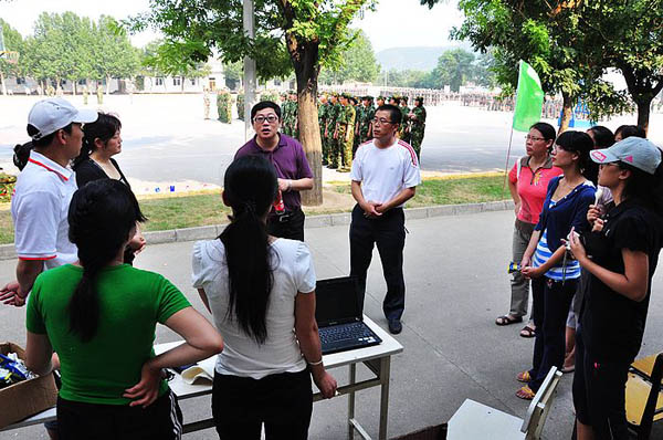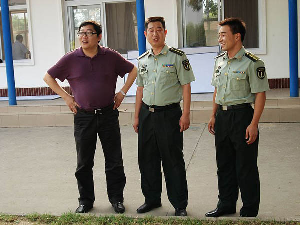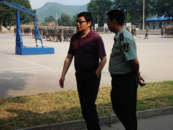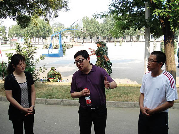 2011年8月22日下午3點,沈軍校長到軍訓基地慰問正在接受軍事訓練的學生以及隨行教師。在96528部隊首長、八一中學學生處吳安寶老師和高一年級組組長崔素云老師的陪同下,沈校長視察了學生的訓練情況,詳細詢問了學生的生活及身體狀況,并為師生們分發(fā)了消暑慰問品。學生們歡欣鼓舞,齊聲高唱八一中學校歌,并向校長致敬。