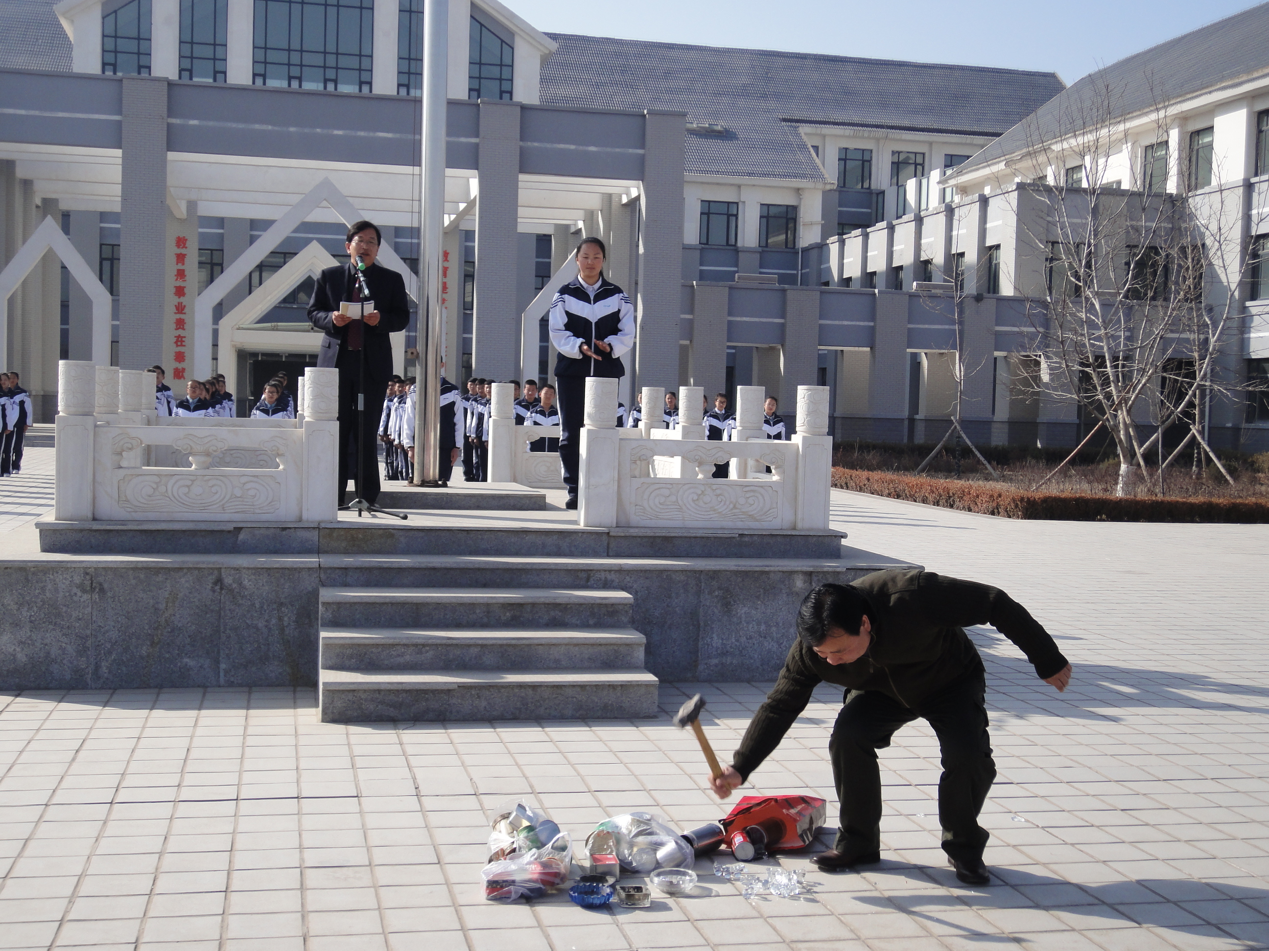 為了啟發(fā)教育學(xué)生,?!翱?zé)煛鳖I(lǐng)導(dǎo)小組動員吸煙的教職工簽字保證戒煙或者在校園不吸煙。3月10日晨會上,學(xué)校蘇曉雋校長親自做報告,宣布回民中學(xué)從即日起為“無煙學(xué)?!?,并當(dāng)場砸毀了教職工辦公室里收繳的煙灰缸,以示回民中學(xué)“控?zé)煛钡臎Q心,師生拍手稱快。
