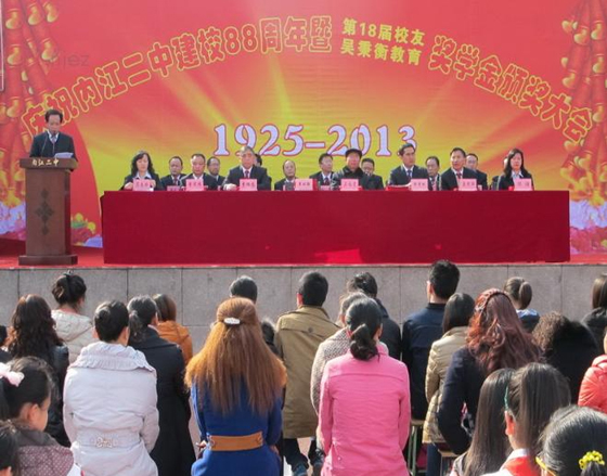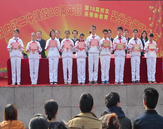 12月12日,是內(nèi)江二中的建校之日,今天全校五千余名師生員工在學(xué)校運(yùn)動(dòng)場歡聚一堂,隆重舉行慶祝內(nèi)江二中(原沱江中學(xué))建校88周年,并進(jìn)行了第十八屆校友獎(jiǎng)學(xué)金和吳秉衡教育獎(jiǎng)學(xué)金頒獎(jiǎng)儀式及慶校慶文藝表演。