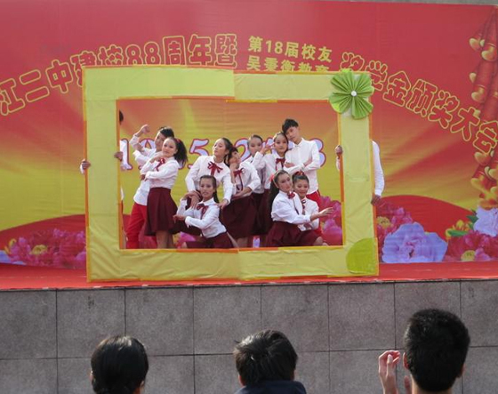 大會(huì)結(jié)束后,舉行了“慶校慶文藝匯演”,在現(xiàn)代舞《青春紀(jì)念冊》拉開帷幕,舞蹈《我是誰》、《改變》、《街舞世界》、《青花瓷》、《紅是紅祿是祿》等,同學(xué)們以優(yōu)美的舞姿,燦爛的笑容,抒發(fā)了全校師生熱愛祖國、熱愛家鄉(xiāng),熱愛母校的美好情感;歌伴舞、拉丁舞、相聲、小品表演,展現(xiàn)出新一代二中學(xué)生積極向上、朝氣蓬勃的精神面貌。